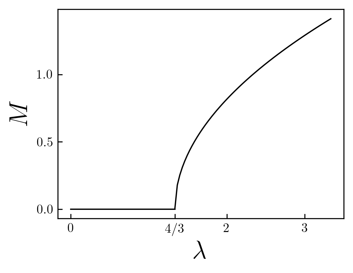Qualitative behavior of the magnetization \(M\) as a function of the coulomb repulsive interaction \(\lambda\): above \(\lambda_c=4/3\) the magnetization grows as a power low in \((\lambda-\lambda_c)^{1/2}\).