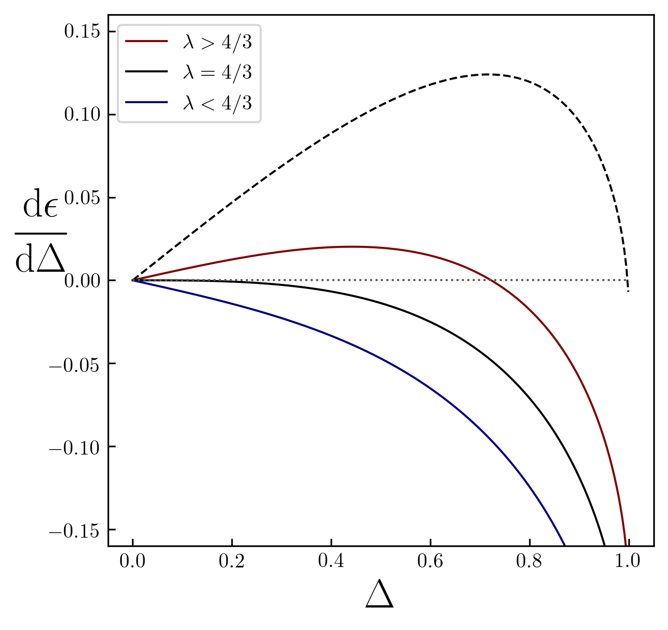 occurs at \(0< \Delta < 1\) for \(4/3 < \lambda < 2^{2/3}\) (for \(\lambda > 2^{2/3}\) there is no solution). The critical value,